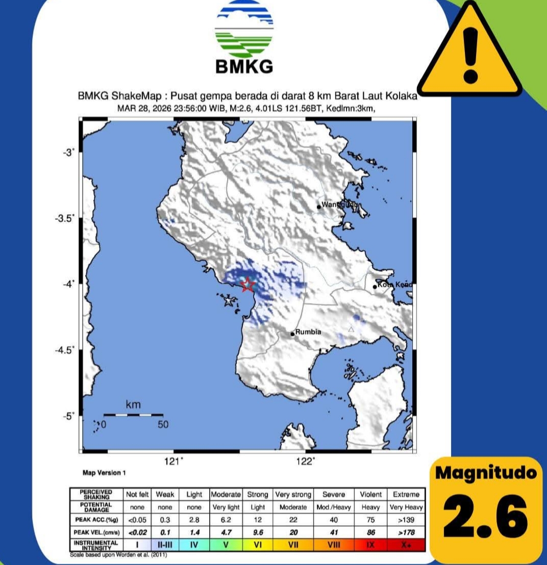 KOLAKA, REPUBLIX.ID – Gempa bumi tektonik berkekuatan magnitudo 2,6 mengguncang wilayah Kabupaten Kolaka, Sulawesi Tenggara, Sabtu (28/3/2026) malam. Peristiwa ini terjadi sekitar pukul 23.56 WIB dan sempat dirasakan warga di sejumlah wilayah.