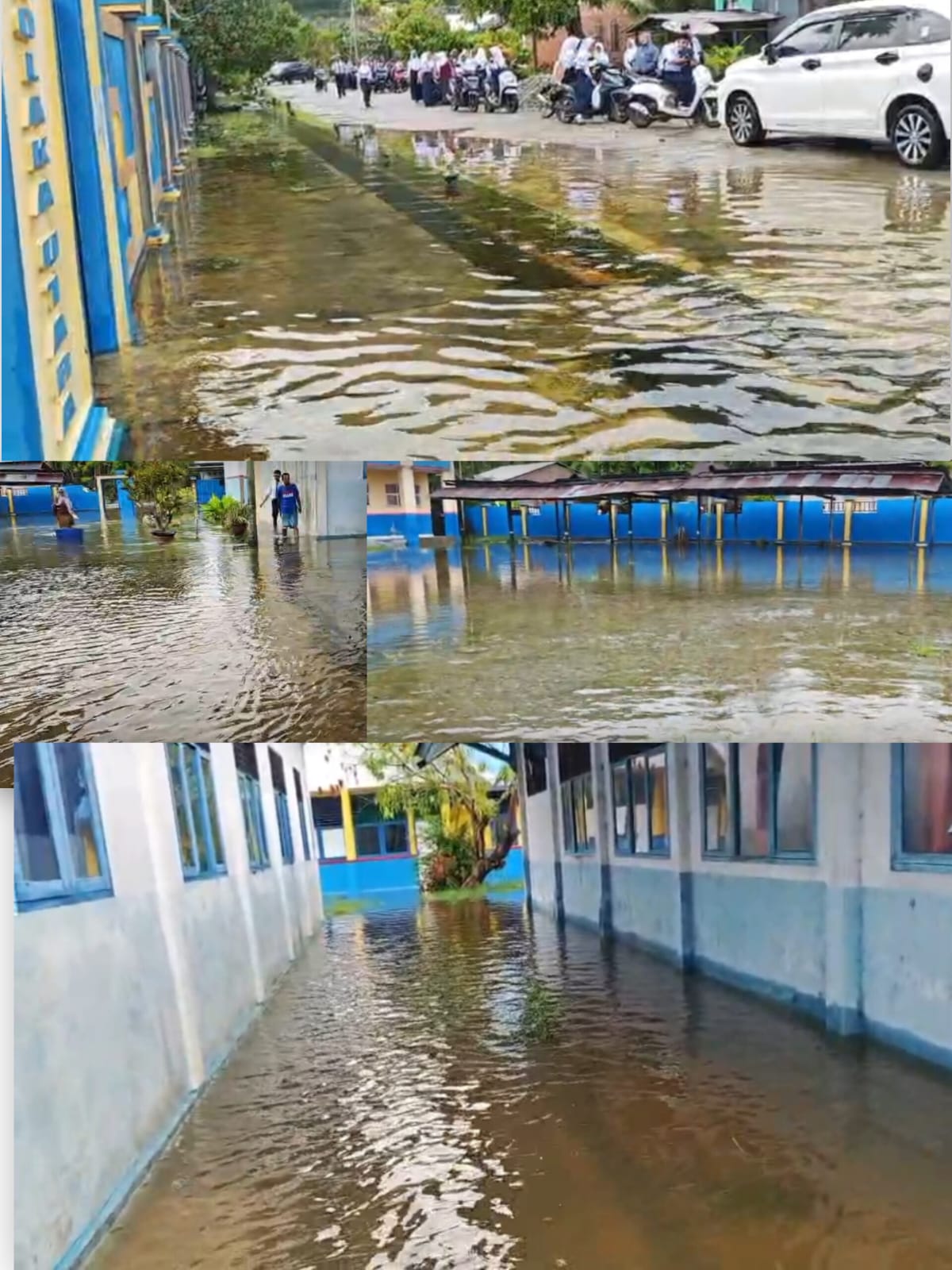 Dalam video berdurasi 52 detik yang beredar, terlihat arus air mengalir deras menyerupai sungai kecil dan masuk ke halaman sekolah hingga mendekati ruang kelas.