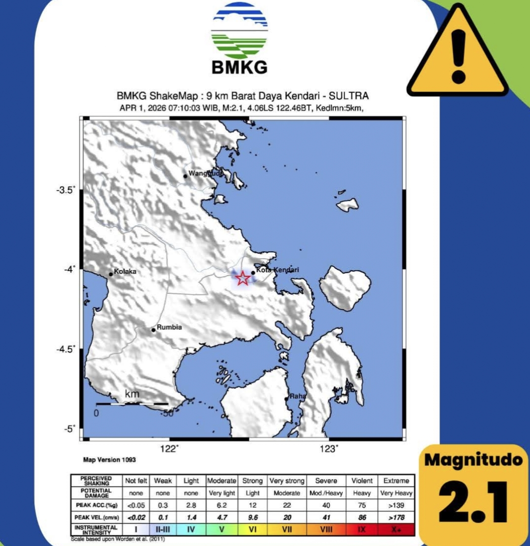 Kota Kendari Diguncang Gempa M 2,1 Pagi Ini, Getaran Terasa hingga Konawe Selatan