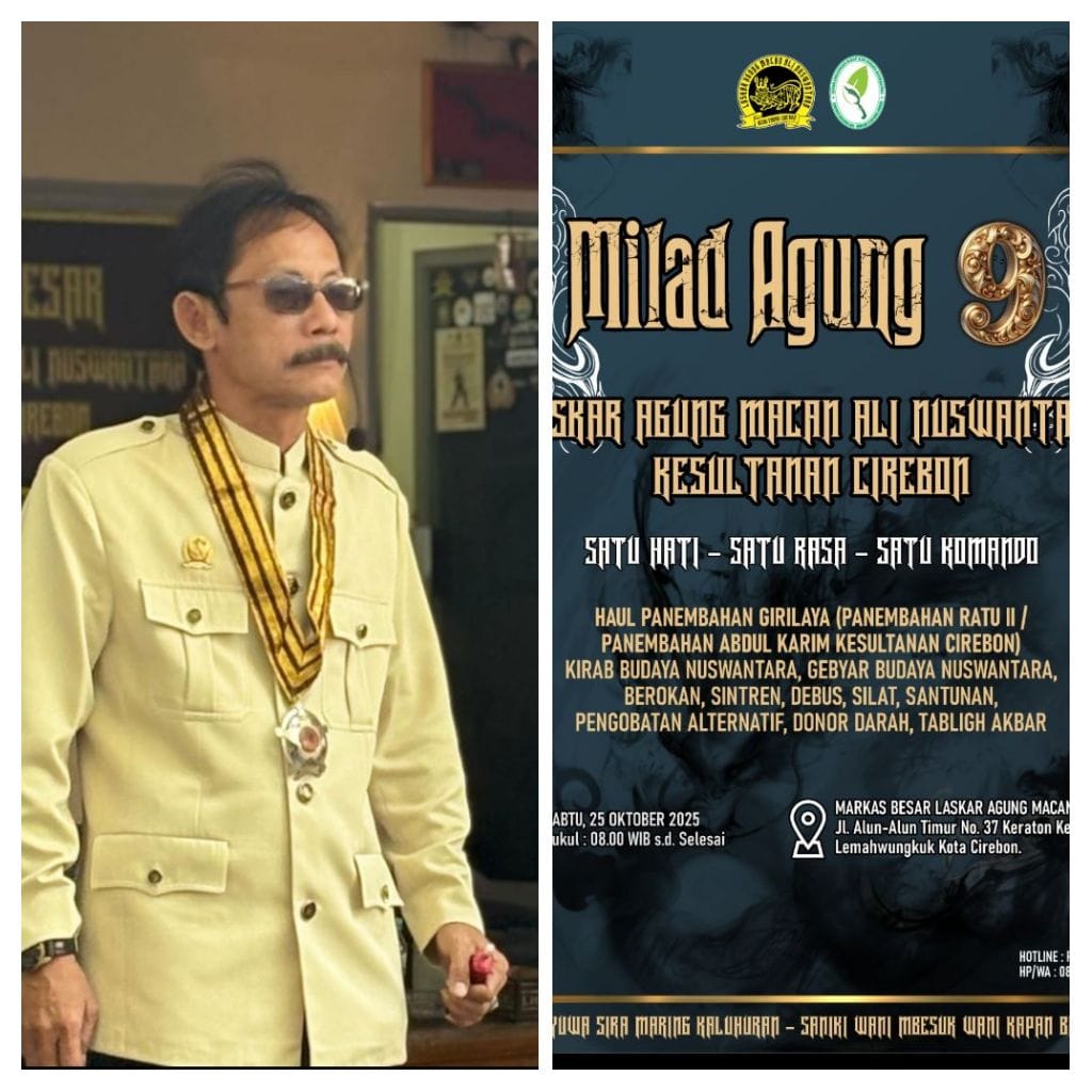 Cirebon Kota – Laskar Agung Macan Ali Nuswantara Kesultanan Cirebon akan menggelar peringatan Milad Agung ke-9 pada Sabtu, 25 Oktober 2025, bertempat di Markas Besar Laskar Agung Macan Ali, Jalan Alun-Alun Timur No. 37, Keraton Kasepuhan, Lemahwungkuk, Kota Cirebon.